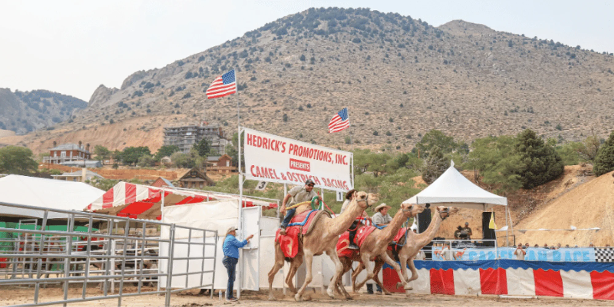 It’s the 67th International Camel & Ostrich Races and its guaranteed to be as hilariously crazy as it sounds! Watch as camels, ostriches and even zebras gather in Virginia City to carry daring riders across the finish line in this family-friendly, must-see event. THE SHOW With four shows across three days, this is fantastic fun you won’t want to miss. You may even get your chance to ride on a camel! Hot Camel Nights – a special Friday evening performance at 5 p.m. Saturday 2-shows at 10 a.m. and 2 p.m. Saturday’s Camel Hump to C Street, 12:30 & 1:30 p.m. Sunday Family Day – 12 p.m. show, first 100 kids ride a camel for free SEATS & SHUTTLES Seats for this event range from grandstands to VIP – something for everyone. Choose between the grandstands which offer a chance to feel the action with the crowds or shaded options in premium seating. For the ultimate experience, select VIP which is air conditioned with tables and a fully stocked bar. Need to get around? Hop on one of the free shuttles to explore all things Virginia City! On Saturday and Sunday, the shuttles run to and from C Street and the Fairgrounds and Arena. Before or after the show, grab a bite at one of our restaurants, peruse the one-of-a-kind shops for unique gifts, grab a drink at one of the famous saloons, go on a mine or ghost tour, discover history in one of the town’s many museums, and get an old-time photo to commemorate the day. Make a weekend of it and View Virginia City’s lodging options here. THE LEGEND One of Nevada’s most iconic events started because of a prank war between Virginia City’s Territorial Enterprise and the San Francisco Chronicle. In1959, the editor of the Enterprise wrote a fake story about camels racing in Virginia City. The Chronicle didn’t realize it was a hoax and printed it. The following year, they borrowed camels from the San Francisco Zoo and took them to Virginia City to race them. And that’s how a tradition was born. KNOW BEFORE YOU GO *Kids 2 and under are FREE! They must sit on a lap. *Parking is available at the Virginia City Fairgrounds & Arena and in town. A complimentary golf cart runs from the Fairgrounds parking lot to the arena to assist the elderly, disabled and those with limited mobility. *No pets are allowed inside the venue because they spook the animals. The event complies with all state and federal laws regarding service animals. If you require a service animal, the animal must stay away from the arena fence. *No umbrellas are allowed inside the venue because they block the view for other race fans. *No outside food or drink is allowed inside venue. *No weapons of any kind are allowed inside the venue. **ALL VCTC EVENTS ARE RAIN OR SHINE AND NON-REFUNDABLE** Photo and/or video may be produced from this event, and by purchasing this ticket you are consenting to allow your likeness to be used in future Virginia City marketing materials.Ê
