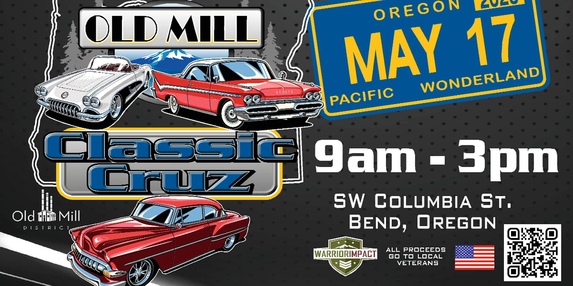 The 2nd Annual Old Mill Classic Cruz Car Show returns to the Old Mill District on May 17, 2026, from 9 AM–3 PM. Enjoy a full day of classic cars, community spirit, and riverfront fun. All proceeds support Warrior Impact of Central Oregon, serving local Veterans and first responders. Join us for an unforgettable day in the Old Mill District!