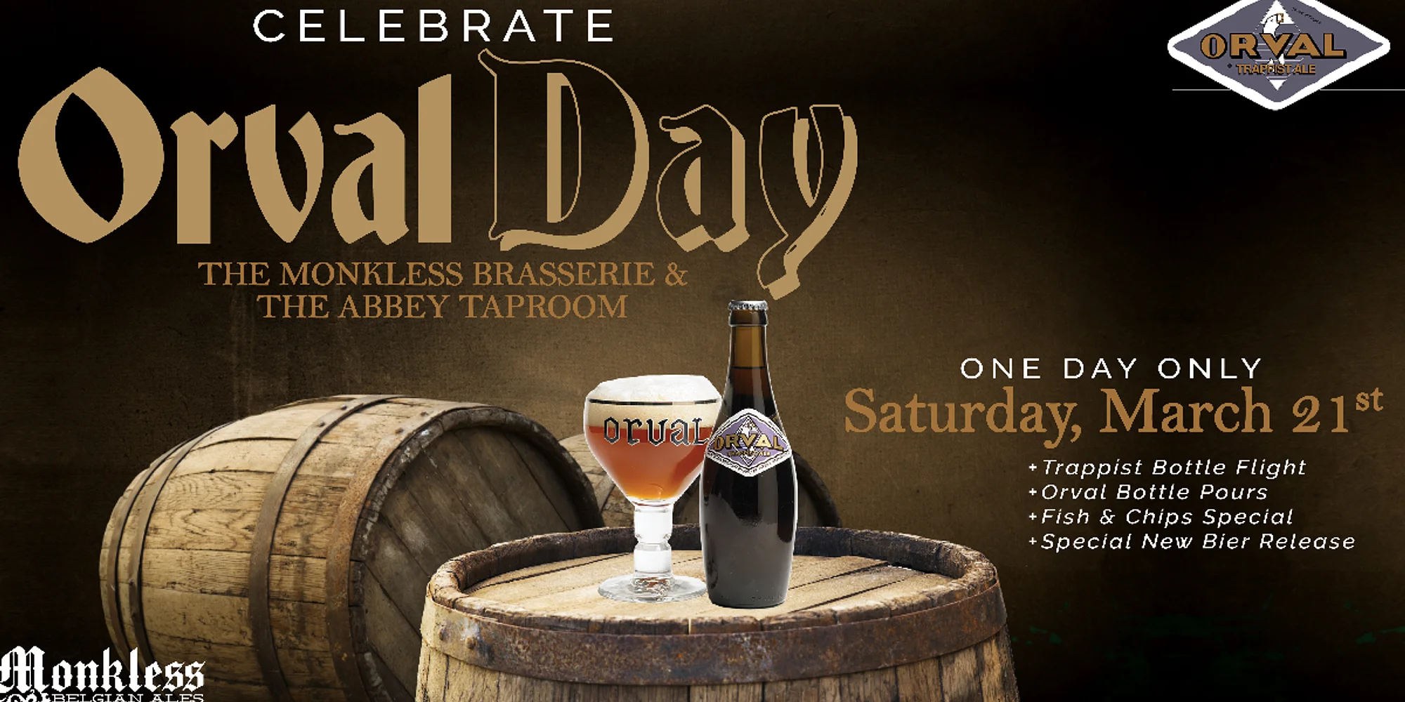 Join us Saturday, March 21st as we celebrate Orval Day at both The Monkless Brasserie and The Abbey Taproom. Each year, beer lovers around the world raise a glass to Orval Trappist Ale—one of the most distinctive and storied beers ever brewed. Crafted by Trappist monks in Belgium, Orval is known for its glowing amber hue, bright citrus and earthy aromatics, firm bitterness, and signature dry, complex finish, thanks to the use of Brettanomyces yeast. For one day only, enjoy this iconic beer alongside special offerings at both locations: The Monkless Brasserie | 11:30am – 10pm • Trappist Bottle Flight featuring Orval Pale Ale, Westmalle Tripel, and Rochefort 8 Strong Ale • Single Orval bottle pours • Fish & Chips food special • Limited beer release, available Saturday only The Abbey Taproom | 3pm – 8pm • Trappist Bottle Flight featuring Orval Pale Ale, Westmalle Tripel, and Rochefort 8 Strong Ale • Single Orval bottle pours • Limited beer release, available Saturday only • Games + live streaming of March Madness Whether you’re a longtime fan or discovering Orval for the first time, this is your chance to experience a true classic. Gather your crew, settle in, and raise a glass with us.