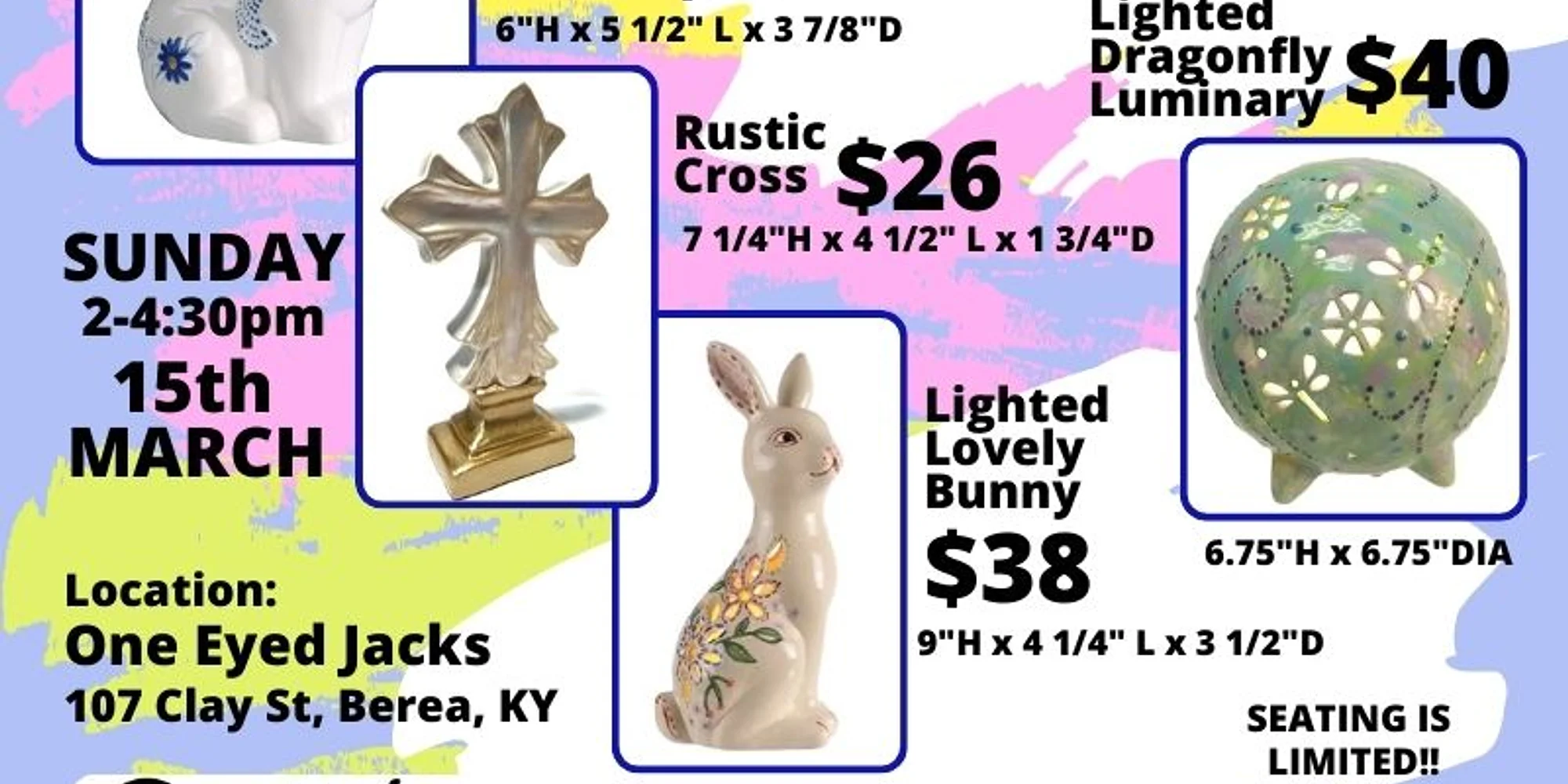 Join us for an afternoon of painting FUN with these adorable ceramics! There are 4 selections for you to choose from: Lighted Lovely Bunny, Lighted Baroque Bunny, Rustic Cross and Lighted Dragonfly Luminary. WHEN: Sunday, March 15th TIME: 2:00-4:30PM LOCATIONS: One Eyed Jacks Social
