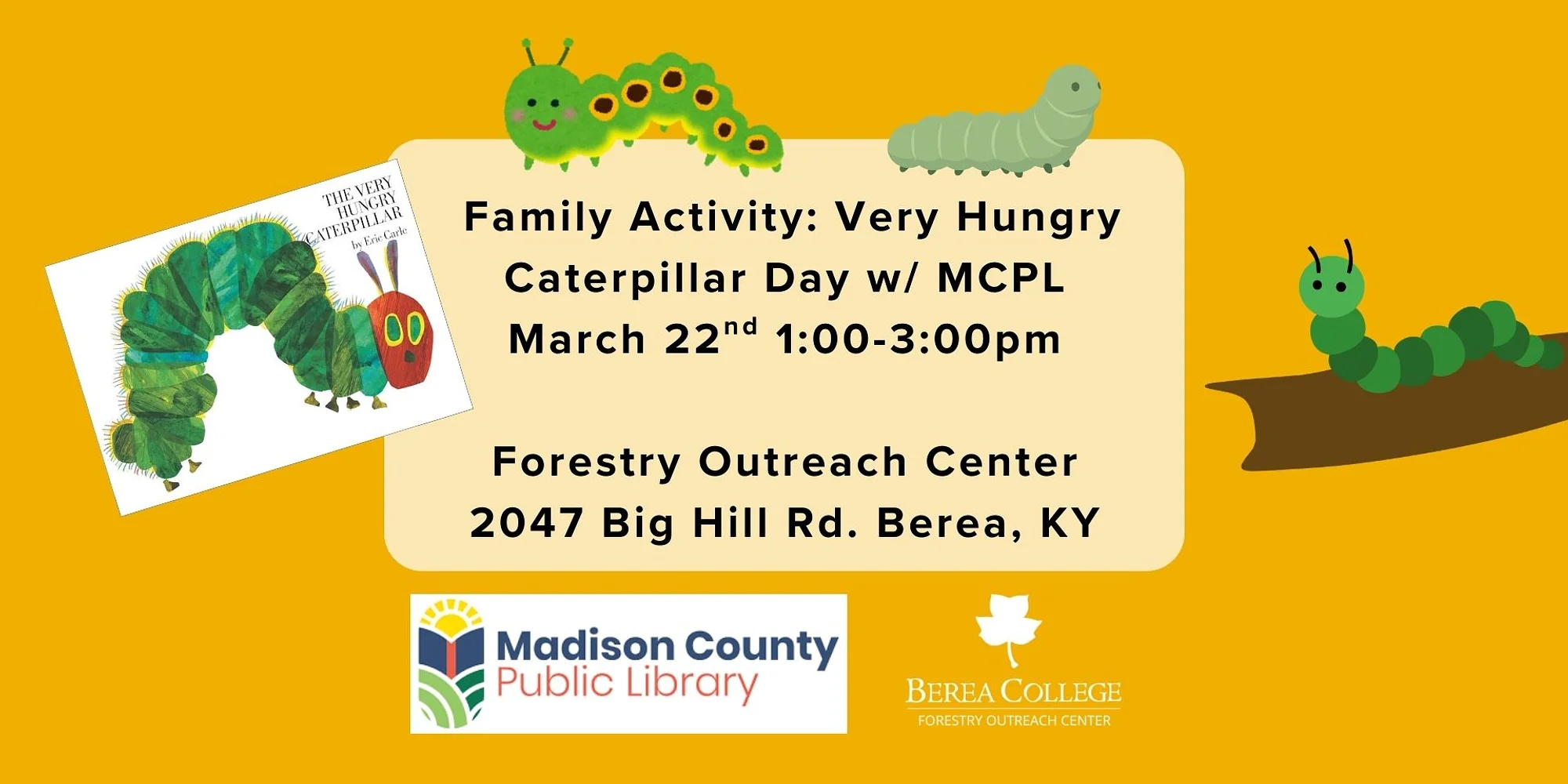 Join us and the Madison County Public Library to celebrate spring, caterpillars, and Eric Carle’s The Very Hungry Caterpillar and more. We’ll have a pop up library where you can read and check out books, as well as lots of crafts to learn and celebrate caterpillars, moths, and butterflies–amazing and essential animals in our ecosystem. Enjoy this free event, geared to kids middle school and younger.