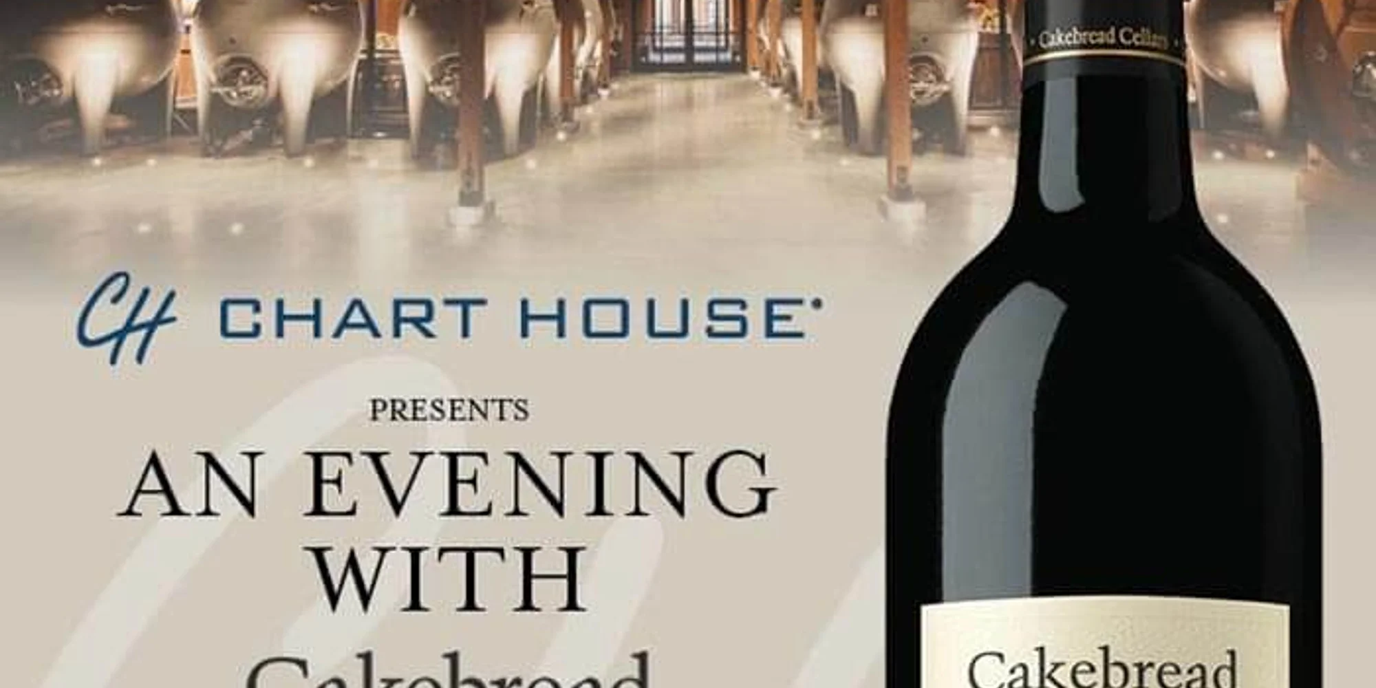 @ Thursday, July 16, 2026, Join the Chart House for an exquisite five course meal expertly paired with wines from Cakebread Cellars. $159 per person, inclusive of tax and gratuity. Tickets For the menu and more information, please visit https://www.chart-house.com/event/cakebread-cellars-wine-dinner/.