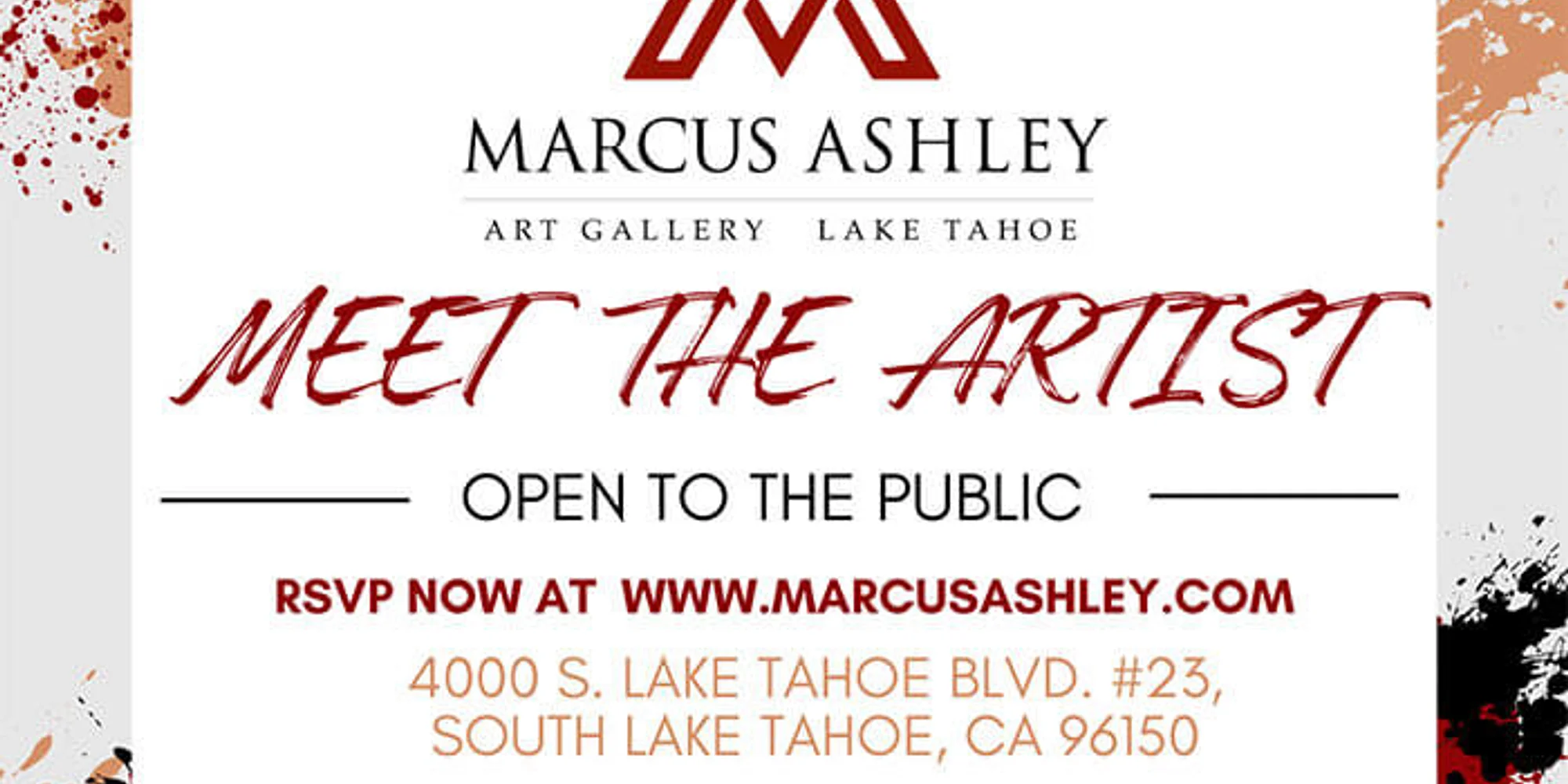 @ South Lake Tahoe Art Events Marcus Ashley Gallery hosts a variety of inspiring and entertaining South Lake Tahoe events throughout the year. We feature talented artists ready to share their expertise or discuss their work. Our events are often paired with activities like wine tasting, raffles, and meet-and-greets with the artists. Get a taste of the local art scene in the Sierra Mountains. Tap here for event details Meet The Artist ~ Alexander Volkov ~ March 13th & 14th See Alexander Volkov’s first-ever Emerald Bay Window! March 13th & 14th 12:00 to 5:00 pm RSVP – register here Meet the Artist – Sally Maxwell March 27 – 28, 2026 12:00 to 5:00 pm RSVP – register here Meet the Artist ~ Maya Eventov ~ July 24 – 25 July 24 and 25 12:00 and 5:00 pm RSVP – register here Meet the Artist ~ Mackezie Thorpe ~ August 7 – 8 12:00pm – 5:00pm Meet the Artist ~ Fabio Napoleani ~ August 22 – 23 12:00 PM – 5:00 PM August 22 – 23 RSVP – register here Meet the Artist ~ Michael Parkes ~ October 2 – 3 12:00 – 5:00 pm October 2 – 3 RSVP – register here If you’ve come to Lake Tahoe for the great outdoors but inclement weather has changed your plans, we welcome you to come stay dry in our gallery. We promise you’ll never be bored here. You don’t always have to plan to attend one of our South Lake Tahoe events, but we encourage it! As always, contact the friendly and knowledgeable staff at Marcus Ashley Gallery if you have any questions about our upcoming events or visiting artists. We look forward to welcoming you into your new home away from home!