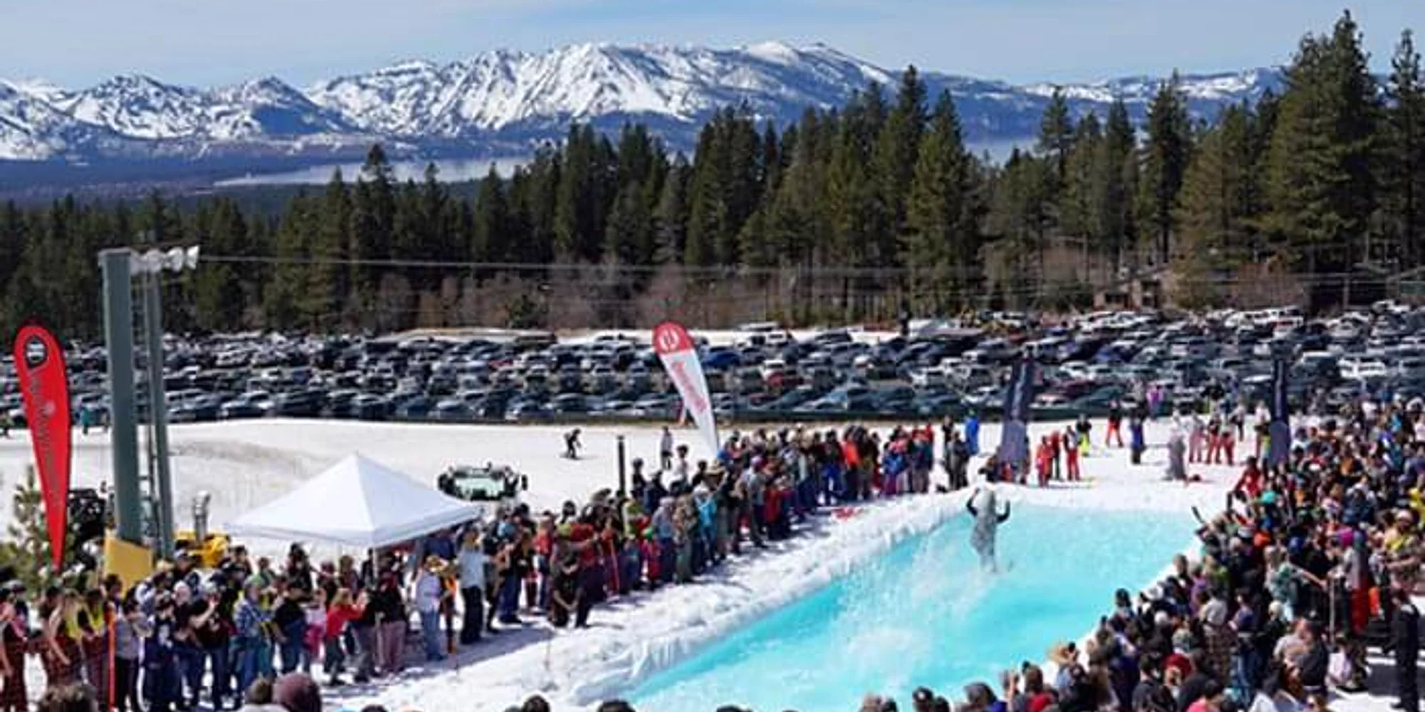@ On Saturday, April 11, 2026, funky costumes are encouraged for this chilly tradition! Contestants attempt to ski or board across a pond of water on the mountain top! Come celebrate spring and see if you can make it across the pond or cheer on others as they skim or sink! At the base of the World Cup/Base of Tram area. (Note: Date is tentative and may change) The event brings dressed-to-impress skiers and riders in onesies and tutus together to celebrate spring and see if they have what it takes to ski down and skim across a small manmade pool. With Kona Brewing and Venture as sponsors we’re sure to have a ‘beachin’ time! We’ll have great food, good drinks, giveaways, and more! Dress your best and meet us for the iconic pond skim. Registration: Morning of only! Start at 7:30am in Cal Lodge Pond Skim: 1-3pm Après Party @ Cal Lodge w/live music: 3-5pm *DATE IS SUBJECT TO CHANGE; BASED ON CLOSING DAY* More information can be found here. Details Date: Time: