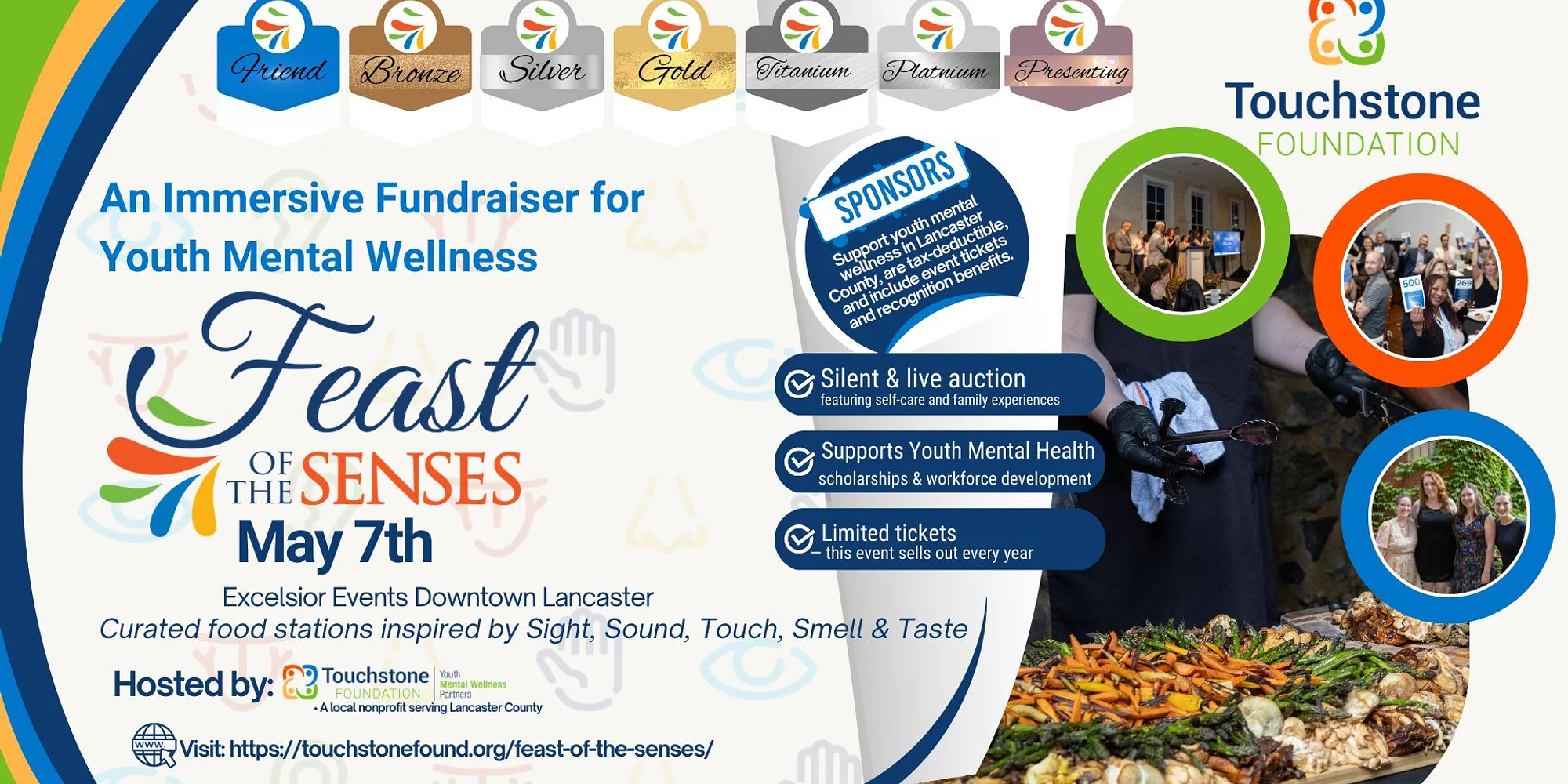 at Feast of the Senses is Touchstone Foundation’s signature annual event and auction benefiting youth mental wellness in Lancaster County. This immersive evening invites guests to experience food, art, and music through thoughtfully curated sensory stations, each representing a Touchstone program and the impact it creates for youth in our community. Guests will enjoy seasonal cuisine, interactive experiences, a silent and live auction, and powerful stories of impact from students and families served through Touchstone’s programs, including mental health access assistance, mentorship through Rise Above, student career exploration, and clinical fellowships. Proceeds from the evening help remove financial barriers to therapy, connect youth with trusted mentors, and support the next generation of mental health professionals serving Lancaster County. Join us for an unforgettable evening that engages the senses and supports a mission that changes lives. Touchstone Foundation View Organizer Website Add to calendar Google Calendar iCalendar Outlook 365 Outlook Live