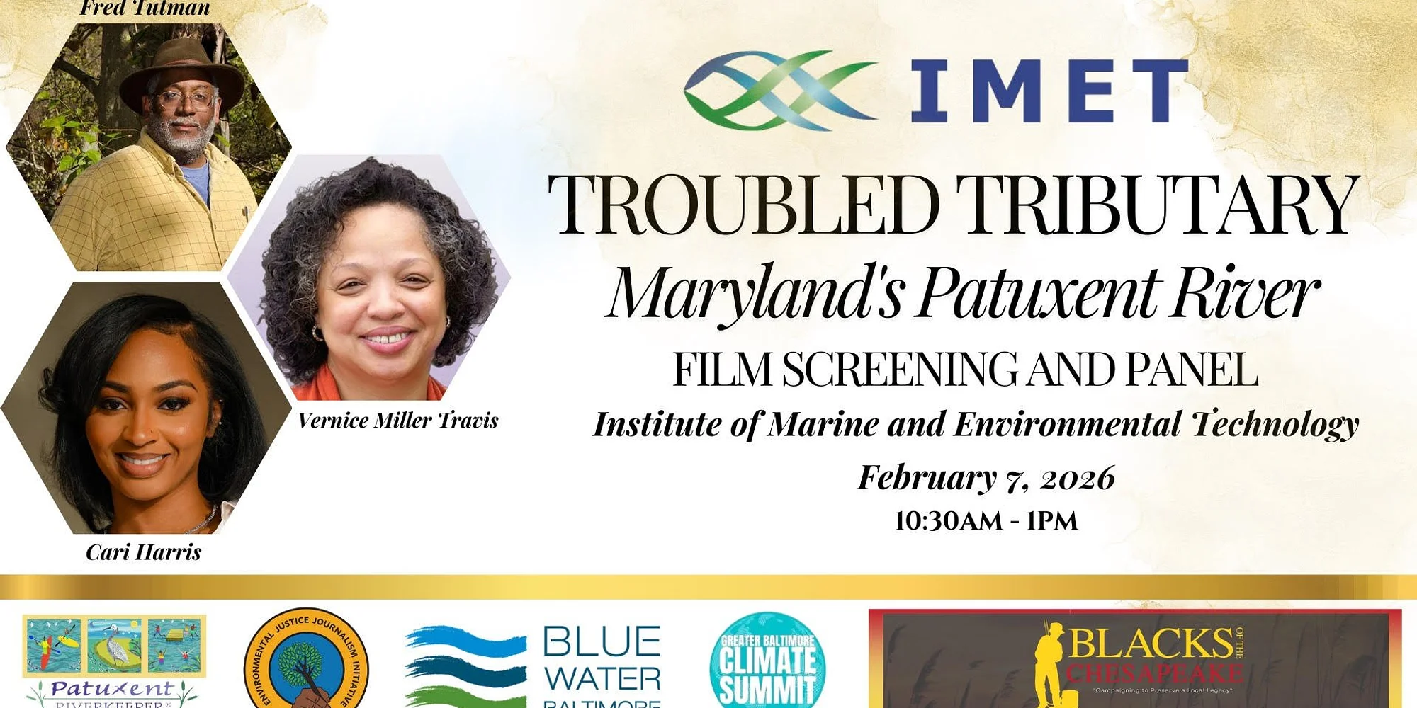 IMET is pleased to invite you to a special film screening and panel discussion, Troubled Tributary: Maryland’s Patuxent River, taking place at IMET on February 7, 2026, from 10:30 AM to 1:00 PM. This short documentary examines the environmental challenges facing the Patuxent River and highlights the vital role of community advocacy, science, and environmental justice in protecting Maryland’s waterways. The screening will be followed by a panel discussion featuring Fred Tutman (Patuxent Riverkeeper), Vernice Miller-Travis Miller Travis (Environmental Justice Pioneer), and Cari Harris (Founder of Greater Baltimore Climate Summit), who will share insights and engage in dialogue around environmental stewardship, people of color in the environmental justice movement, and solution driven environmental work.