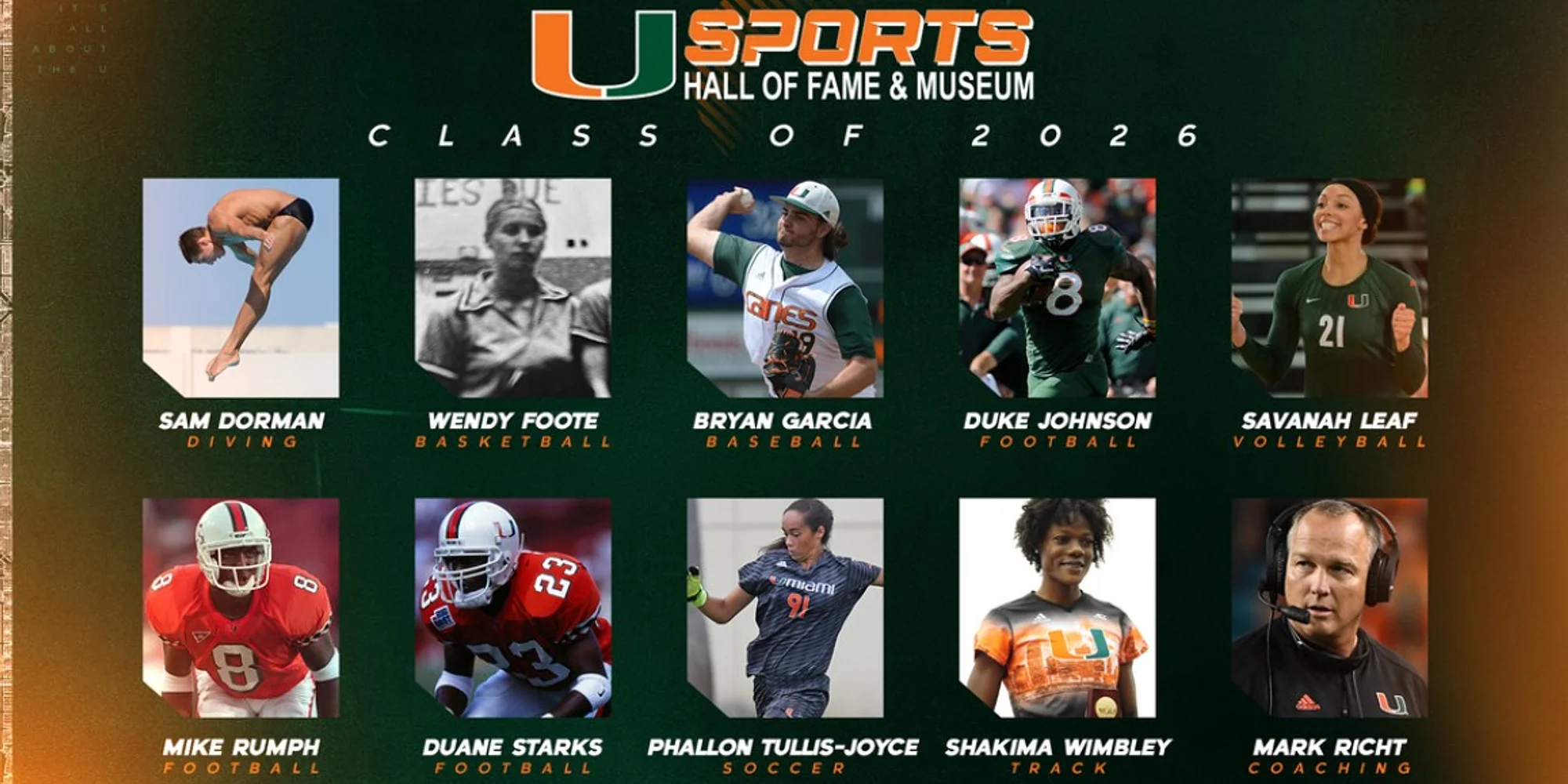 Celebrate the UM Sports Hall of Fame Class of 2026 at the annual Induction Banquet on April 23, 2026 at the Watsco Center. Cocktails begin at 6 PM, followed by dinner at 7 PM as we celebrate and honor this year’s exceptional inductees.