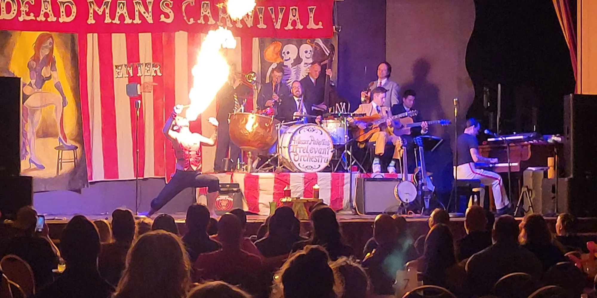 Wega Arts and Prof. Pinkerton presents The Dead Man’s Carnival: The Live music circus variety show triumphantly returns to Weyauwega’s historic Gerold Opera House. Featuring house band “Prof Pinkerton’s Irrelevant Orchestra” with a variety of different acts which may include… Fire eating, Stage Illusions, Aerial Dance, Feats of strength, Burlesque, Human Oddities, Juggling, Comedy and 8 musicians on dozens of vintage instruments! At the Gerold Opera House in Weyauwega. Reserved Seating at tables for 2 – $45 each seat – Must buy 2 Seats at same table Reserved Seating at tables for 4 – $40 each seat Reserved table seating at tables for 8 – $35 each seat General Seating and Balcony seating – $25 (unreserved seating at rear of floor and in the balcony) (select reserved seats from the seating chart when ordering tickets) Doors open at 6:00pm Show starts at 7:30pm The Gerold Features a Full Bar – There will be food and concessions available for purchase Not recommended for kids under 18 years old.