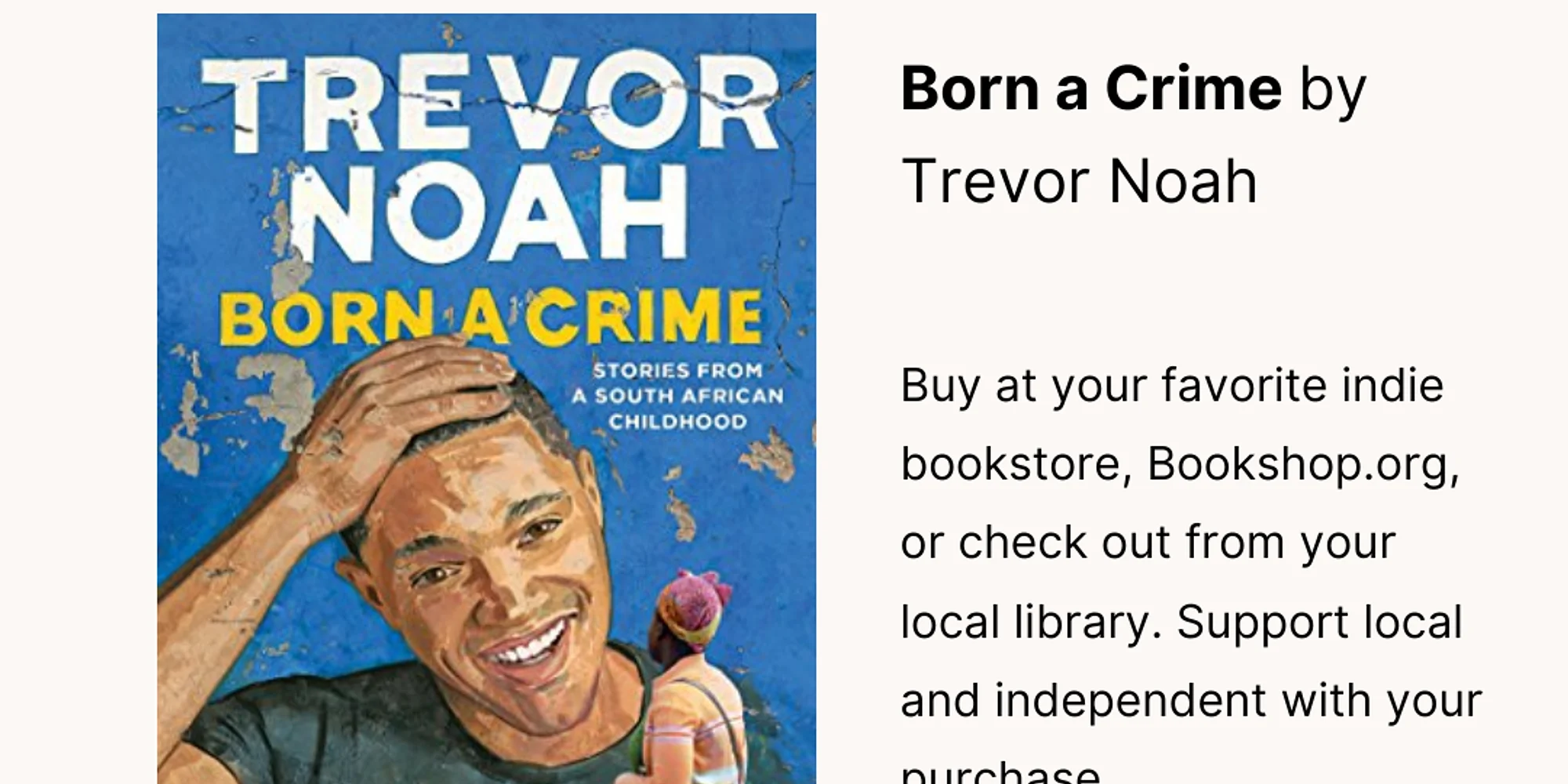 Join us to discuss Born a Crime by Trevor Noah. Buy the book on Bookshop.org here: https://bookshop.org/a/18156/9780399588198