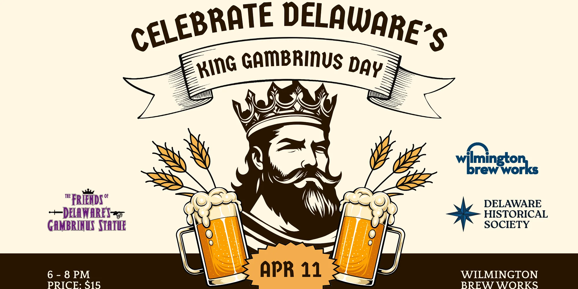 Raise a glass to Delaware’s craft brewing community—and to the legendary King of Beer himself—at Delaware’s King Gambrinus Day, a spirited annual celebration of the First State’s brewing culture. Hosted by the Delaware Historical Society in partnership with the Friends of Delaware’s Gambrinus Statue and Wilmington Brew Works, this special evening brings together local history, craft beer, and community pride. Join us on Saturday, April 11, 2026, from 6:00–8:00 PM in the Alamo Room at Wilmington Brew Works for this entertaining and tasty event. The evening begins with guest registration, relaxed mingling, and a statewide toast to Delaware craft beverage makers at 6:30 PM. Then enjoy an engaging presentation exploring the legend of Gambrinus—the mythical patron king of beer—and his enduring connection to Delaware’s brewing heritage, along with an update on the King Gambrinus statue restoration project. The event concludes with a final taproom toast. Ticket includes a logo tasting glass, two 9-ounce beer pours, light fare, and the presentation. Proceeds from the event benefit Restore the King, the effort to return Delaware’s historic King Gambrinus statue to public display. GET YOUR TICKETS NOW