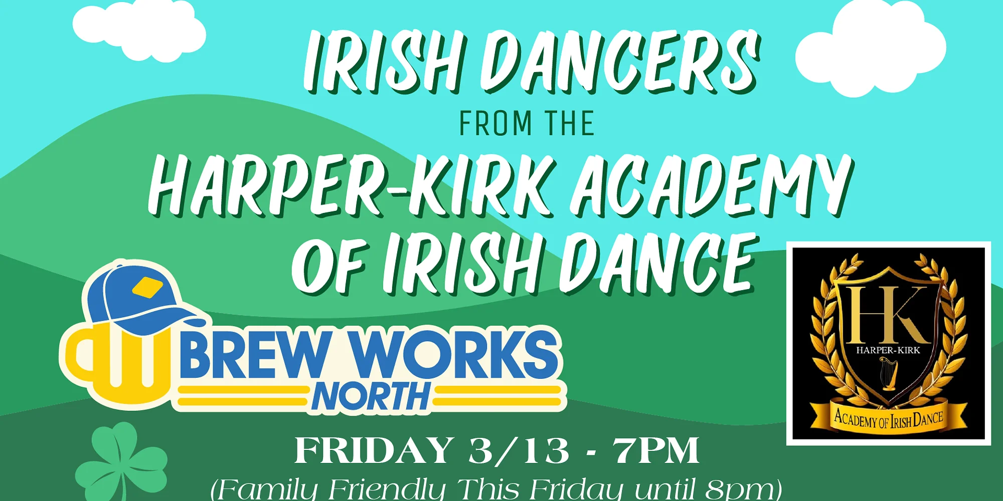 Come Kick Off St. Patrick’s Day Weekend with us as we welcome the Irish Step Dancers from the Harper-Kirk Academy! Brew Works North will be Family Friendly this Friday until 8pm!