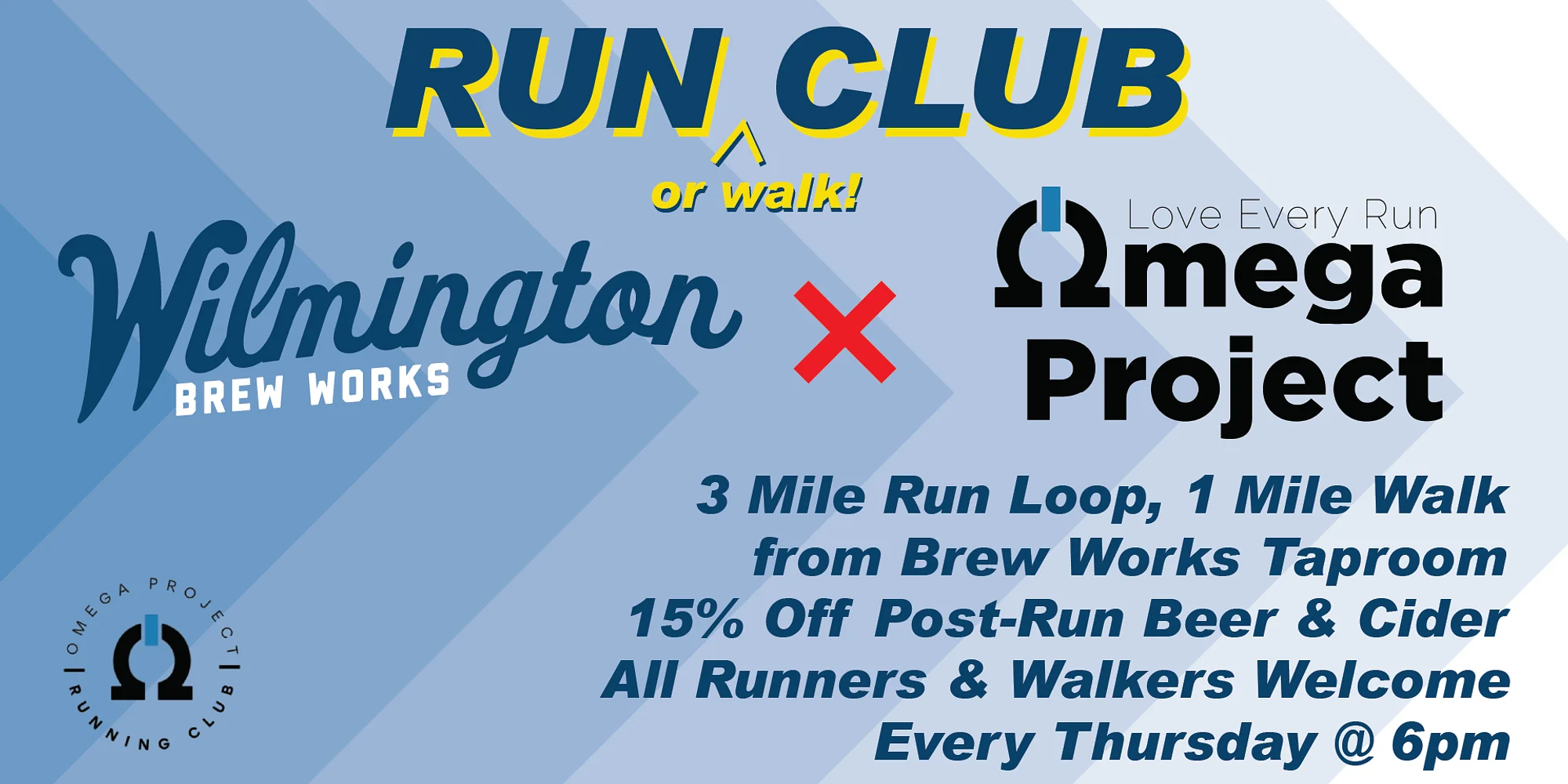 Due to WBW Special Event, Run Club will be at Brew Works North this week. Cheers! —– WBW has teamed up with Omega Project PT for a weekly Run Club. Come on out for an Active Evening! – Thursday Nights at 6pm. Start and finish at the taproom. – 3 Mile Run Loop or 1 Mile Walk Loop from Taproom – All Runners and Walkers of any skill level welcome! – No membership required Hang out and Socialize afterwards! 15% off post-run Beer and Cider!