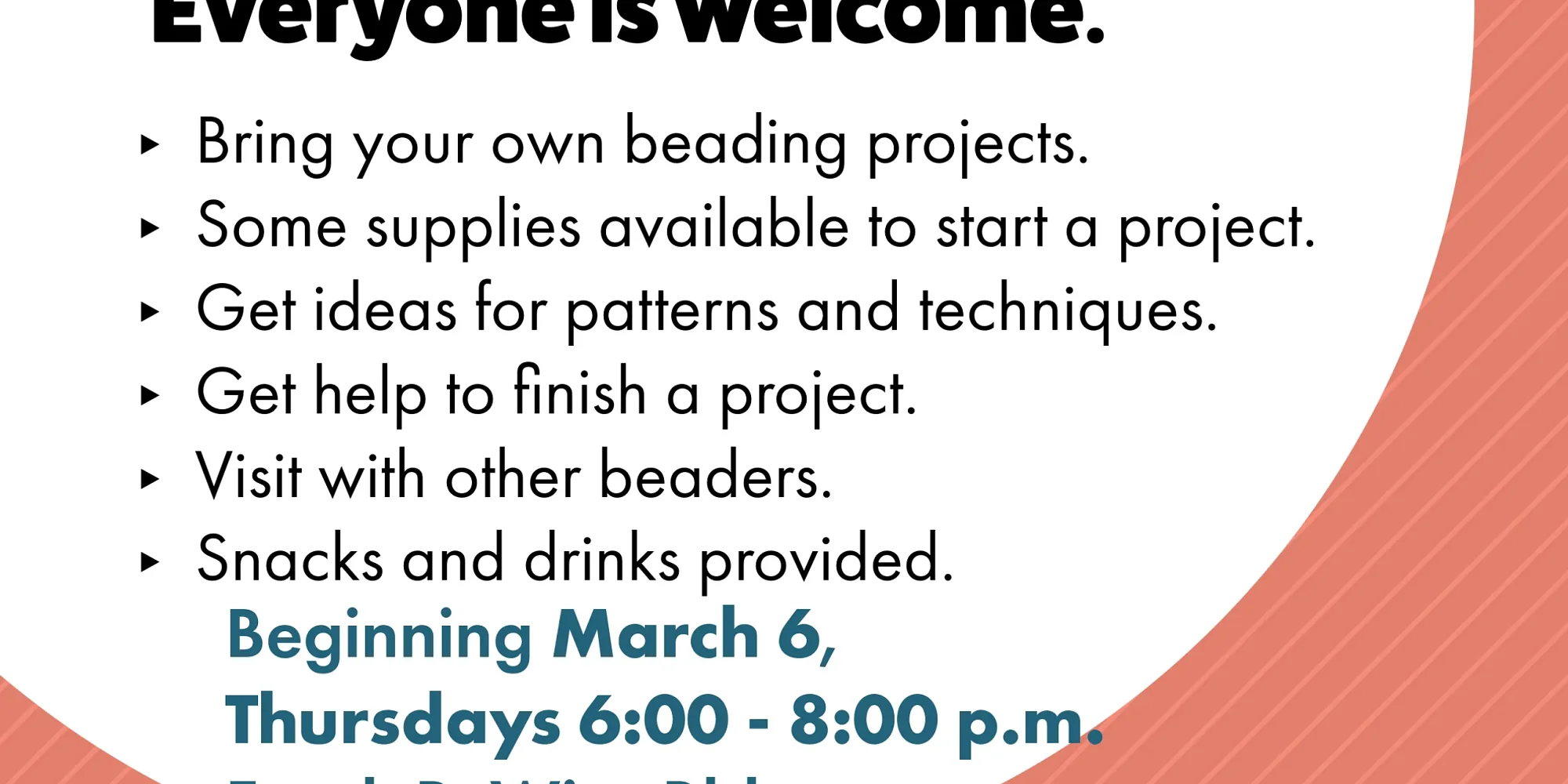 Everyone is welcome at this community event. Bring projects that are in progress or just getting started. Visit with other beaders to share ideas for different patterns and techniques or to get help finishing your current project. Snacks and drinks provided.