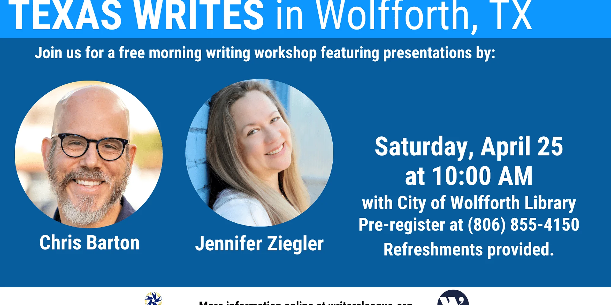 Texas Writes is a statewide program that brings accomplished authors to rural libraries for a half day of presentations and panel discussions focused on the craft of writing. This month, our Wolfforth, TX, program will feature Chris Barton presenting “A Writer’s Guide to Research” and Jennifer Ziegler presenting “The World of Your Character”. We’ll start at 10:00 AM CDT with our presentations and we’ll conclude with a conversation with both authors, moderated by Texas Writes Coordinator Becka Oliver. We hope to see you there! Each event is free and open to the public. Refreshments are provided. To pre-register for this event, contact the library at (806) 855-4150.