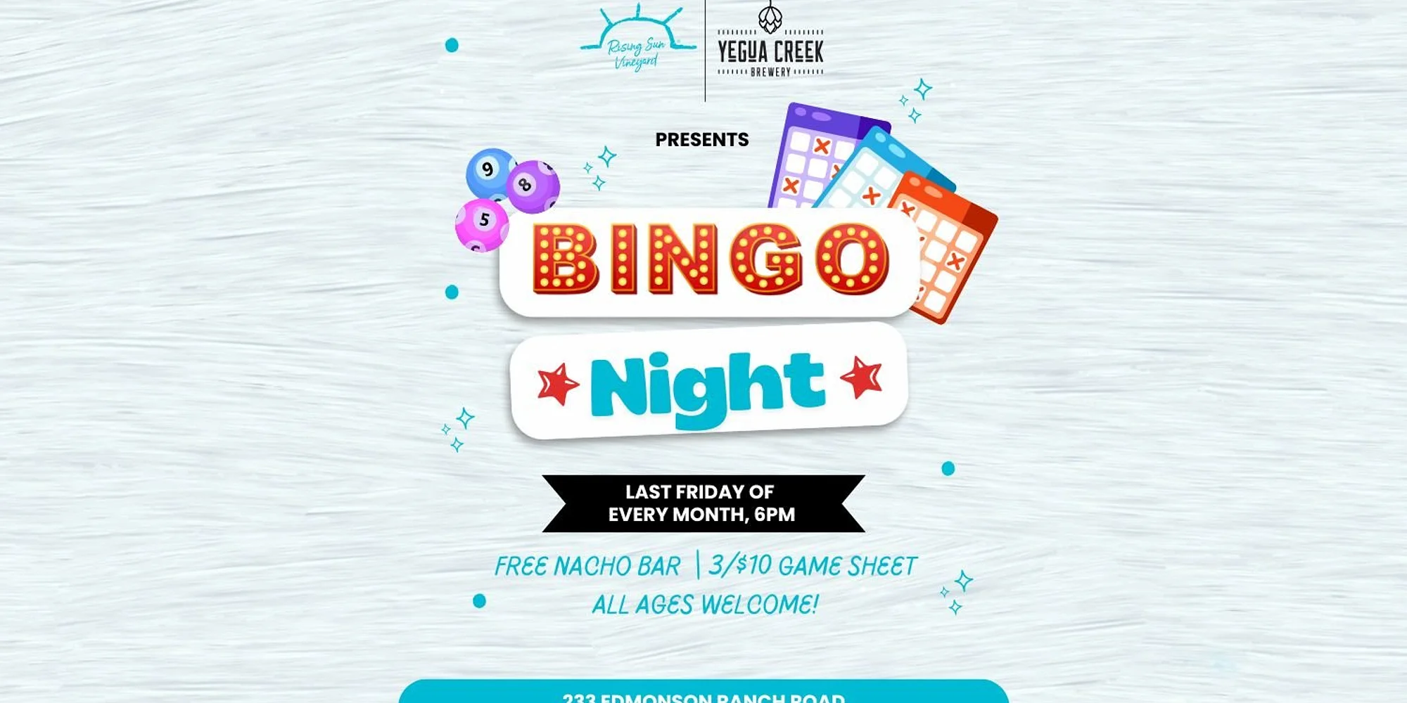 π BINGO Night at Yegua Creek Brewery! π Friday, January 30th for one of our most exciting monthly events β BINGO at the Brewery! π·π Grab your besties, bring your game face (and maybe your lucky underwear ππ), and get ready for a night full of laughs, prizes, and good vibes! ππ ποΈ BINGO cards are just 1 for $5 or 3 for $10, and every player gets access to our FREE loaded nacho bar π§πΆοΈπ₯ β yep, weβre talking snack heaven while you play your way to victory! π₯ Donβt miss out β itβs always a full house. Come for the wine, stay for the BINGO!
