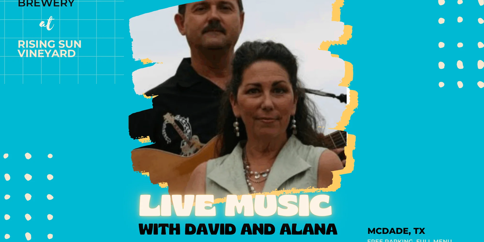 🎶 Live Music Alert with David and Alana on December 20 from 4 to 7! 🎶 Date: Saturday, December 20, 2025 Time: 4:00 PM – 7:00 PM Location: Yegua Creek Brewery at Rising Sun Vineyard – McDade, TX Join us for a festive evening of live music with David and Alana, two of our most beloved local performers! Their warm harmonies and feel-good setlist are the perfect way to wind down the year with friends, family, and great drinks. 🍷 Enjoy award-winning wine from Rising Sun Vineyard 🍺 Sip fresh craft beer brewed on-site 🍔 Full kitchen menu available 🐶 Leashed pets welcome and family friendly No cover charge—just good vibes, cold drinks, and local talent.