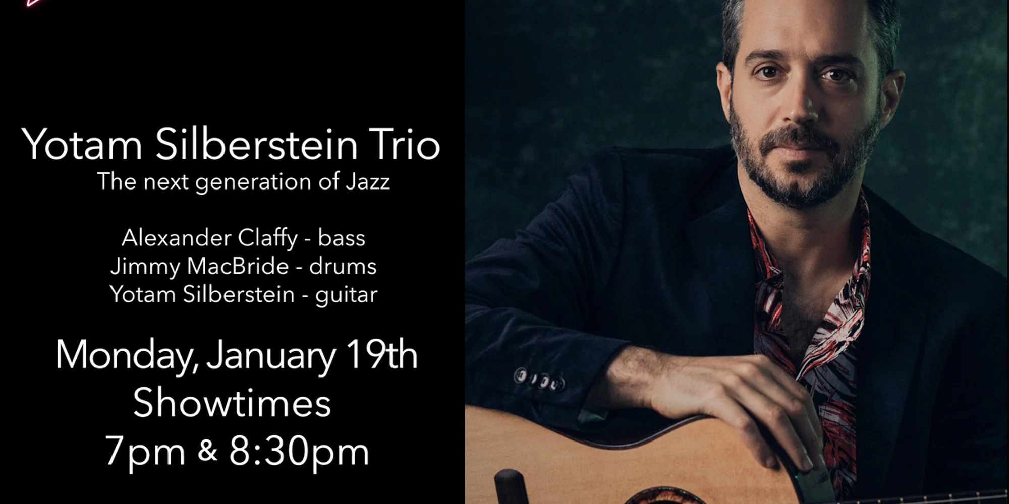 Showtimes: 7:00 PM & 8:30 PM| Tickets: $35 at the door. Reservations: Not necessary. We recommend arriving 20-30 minutes before showtime to secure your seat. Seating: Available throughout the shows. Bar Hours: Open from 5:00 PM to midnight — no cover charge to enjoy cocktails and the vibe! Yotam Silberstein – guitar Alexander Claffy – bass Jimmy MacBride – drums Yotam Silberstein, one of the leading jazz guitarists of his generation, has gained acclaim for a sound rich in bebop and blues as well as musical folklore from South America, North Africa and the Middle East, giving his music an increasingly global thrust. His mature compositional gift and gripping interpretive finesse are vividly represented on his 2022 release Universos and his 2020 outing with Argentine multi-instrumentalist and composer Carlos “Negro” Aguirre titled En el jardín. He is a member of the John Patitucci Trio (heard on the acclaimed album Irmãos de Fé), has toured extensively with legendary Brazilian singer-songwriter Ivan Lins, and played with characteristic fire and taste on Monty Alexander’s GRAMMY-nominated Harlem-Kingston Express Live! as well as David Sanborn & Marcus Miller’s Time and the River. He has worked in bands with some of the greatest figures in jazz including George Coleman, Charles McPherson, Jimmy Heath, James Moody and Roy Hargrove, and has toured with his own groups all over the world in the most prestigious festivals and venues including the Tokyo, Umbria and North Sea Jazz Festivals as well as Kennedy Center, Jazz at Lincoln Center and more. Born in Tel Aviv and based in New York, Yotam was discovered at a young age by the great James Moody. He has evolved into a highly influential artist of his day, hailed by JazzTimes for a musical output “struck through with passion and intimacy,” and by The New York Times as a player who “improvises in a cutting tone and writes heady original tunes that seem to tug the straight-ahead jazz tradition in new directions.” Fueled by a deep love of the jazz lineage and a joyful immersion in choro, samba, frevo, tango and other idioms, he approaches his wide-ranging influences with a near-anthropological meticulousness, conveying a sense not just of technical knowledge but also rich lived experience. Yotam’s earlier releases include Future Memories (“catches you by the heart and never lets go” — JazzTimes), The Village (4 1/2 stars, DownBeat), and Brasil, Resonance and Next Page, which feature musicians on the order of Paquito D’Rivera, Toninho Horta, Roy Hargrove and Christian McBride. “This fantastic album was recorded in New York City, but its influences range from across the globe. Yotam Silberstein has been a native of the jazz mecca since 2005, emerging as a key talent on the contemporary jazz scene.” – ABC Jazz “One of the best guitarists we have ever heard . . . wrapped inside a Mediterranean whirligig of sunshine sounds like a new standard (the melody, stretch your imagination and listen hard . . .) ...
